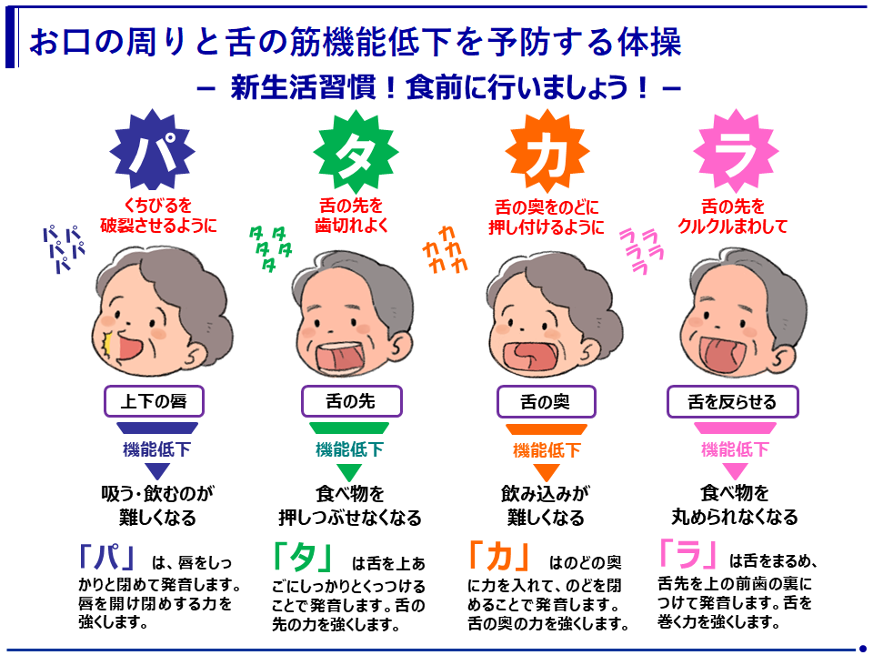 食事の前にパタカラ体操をすると、より飲み込みやすくなります。