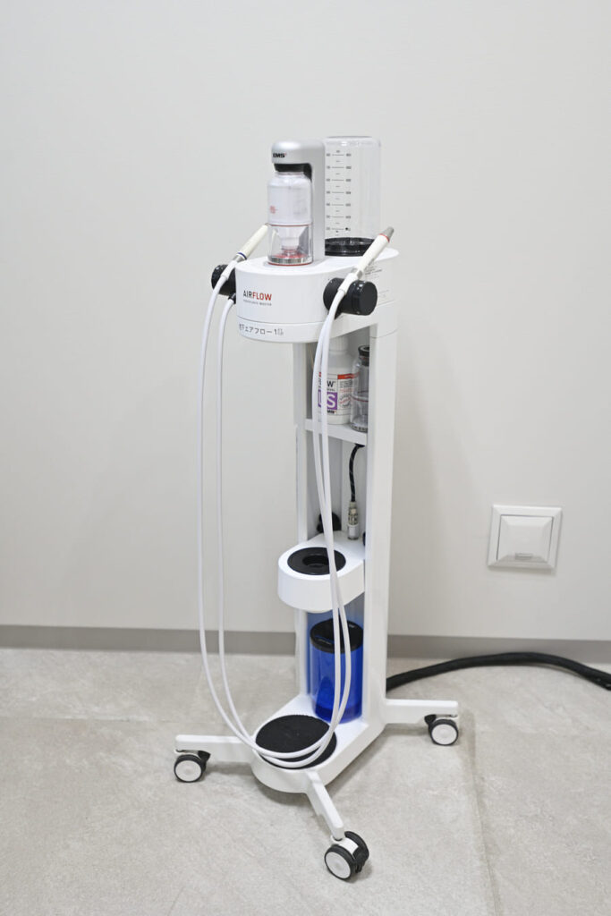 当院では、エアフローという全く歯面を傷つけない機器を使ってバイオフィルムを除去していきます。